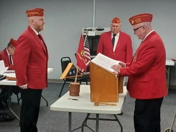 Past Commandant Jeff Gulling(Right) Reads the Duties and Responsibilities to new Commandant Mike Morgenstern (Left). Sergeant-at-Arms Gene McCalpin (Center between the two) is presiding over the installation of Officers.